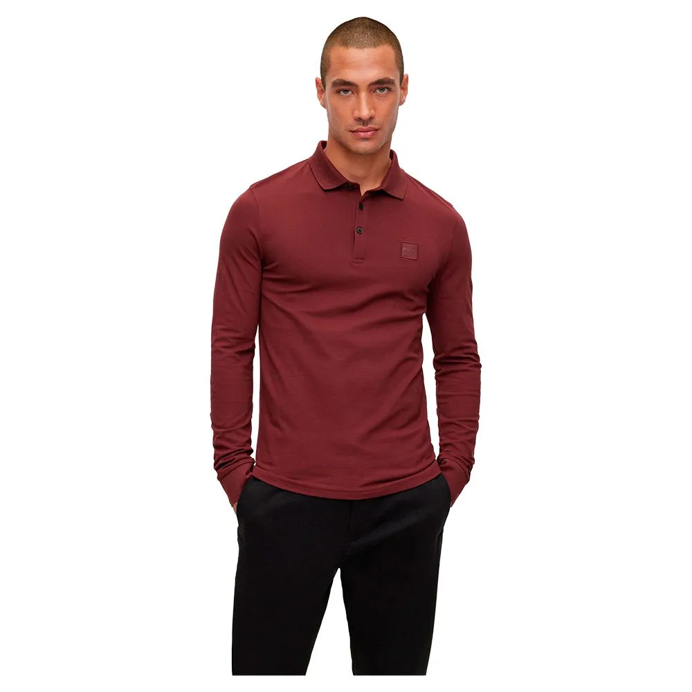 This long sleeve polo is made with elastic cotton in pique, so it is resistant to wear, soft, warm, and flexible. It includes a flat knit collar, three buttons closure, long sleeves with ribbed cuffs, and a slim fit cut that stylizes your body and does not limit you. Like most Boss clothing, it incorporates contrasting lines on the inside of the collar and a logo patch on the left chest.